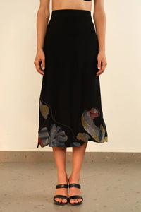 The Sculpted Skirt features a mid-length design crafted from a soft yet structured viscose-polyester-spandex blend. Sculptural floral hand embroidery in muted jewel tones decorates the hem. It is designed to hold its form while allowing graceful movement.