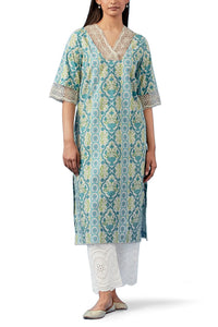 Featuring Sea Blue Aparajita lawn cotton kurta and palazzos with crochet lace detailing.