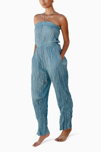Featuring Sea Breeze Jumpsuit by Auruhfy from Advaya Collection. A classic straight crushed jumpsuit with a drawstring waist adorning a straight neckline with a spaghetti sleeve and inseam pockets. The calm and cool of the sea merges with refined everyday comfort in this jumpsuit.