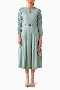 Introducing the Selene Dress: a whimsical sea foam midi that dances with delicate sea shells in pastel hues. Its statement sleeves flutter like ocean waves, embodying the playful elegance of a seaside escapade.