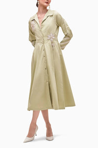 A beautiful sea salt colored midi dress adorned with hand-embroidered flowers, featuring pops of white and silver with delicate beads and lace. The fit and flare cut and convenient pockets make this dress a charming and comfortable choice for any occasion