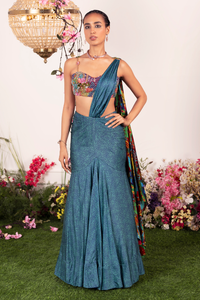 Introducing our enchanting sea saree, beautifully paired with an embellished strap corset for a modern yet elegant look. The soft, flowing fabric of the saree drapes gracefully, while the corset adds a touch of sophistication with its intricate embellishments. This unique combination is perfect for special occasions, allowing you to stand out effortlessly.