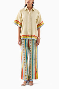 The Seashell Shirt & Trousers co-ord crafted from our stunning 100% Linen fabrication, trans-seasonal, is a statement piece. The piece, made in our digitally printed seashell placement print, is a 2 piece set. With a collar and front opening, the set has a solid hand dyed shirt with contrast borders and lace. Featuring multi stripe sea shell pants, this piece has pockets can be styled in different ways. Wear it with heels for an elegant look.