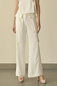 Featuring cargo trousers highlighted with recycled green PVC lines at the pockets, this design flares at the bottom and includes belt loops accented by PVC cords cascading along the side seams, blending utility with a bold, sustainable edge.