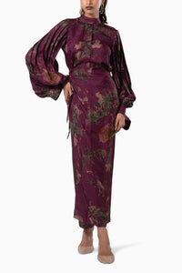 A high neck top with a pleated exaggerated sleeve, paired with a sarong style tie up skirt.