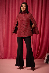 This chic red tweed cape features exquisite ruffle detailing at the neck, adding a playful yet sophisticated touch to your look. The capes structured silhouette drapes elegantly, making it a standout piece for any outfit. Paired with sleek black bell-bottom pants, this ensemble beautifully blends timeless sophistication with contemporary style, creating a bold and fashionable statement.