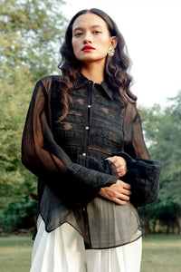 Beautiful silk organza top made with bib lace insert panels featuring a collar neck It is a perfect top for special evenings and can be styled with our black trousers.