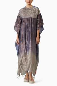 Featuring a free-size striped metallic silk kaftan with our signature shibori neckline, dyed in navy Ombre.