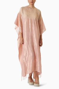 Featuring a free-size striped metallic silk kaftan with our signature shibori neckline, dyed in powder pink.