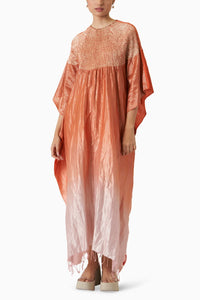 Featuring a free-size striped metallic silk kaftan with our signature shibori neckline, dyed in dark rust to powder pink Ombre.