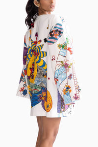Featuring Sefina Ivory Jacket by Saaksha & Kinni from Botanica Collection. Tribal print oversized collarless blazer adorned with intricate mirror, tassel, and thread work. Hand-embroidered scattered motifs add a unique, artisanal touch to this bold and stylish piece.