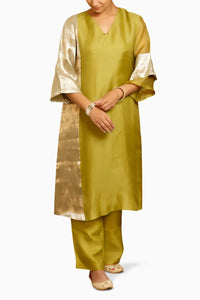 Worn to feel, not to show. A straight, calf-length kurta with a V neckline and curvy elbow-length sleeves, paired with ankle-length straight pants. The relaxed fit and thoughtful cut make it a go-to for all-day elegance.