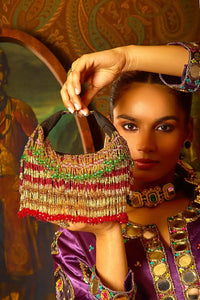 "Faiza Boat Bag" An opulent statement of craft and color. The Faiza Boat Bag is a celebration of meticulous handwork and festive vibrance. Crafted in a signature boat silhouette, this bag is a visual symphony of glass beads in rich tones — ruby red, emerald green, soft rose, deep gold, and crystal accents. Each bead is delicately hand-sewn in layered fringe formations, creating fluid movement with every step you take. The upper half of the bag is adorned with closely packed beadwork in intricate patterns, while the lower half bursts into cascading tassels — giving it a luxurious depth and texture. The handle is cushioned for comfort and dressed in velvet for an elevated feel, making it both stylish and easy to carry.Perfectly proportioned for evening essentials, the Faiza fits your phone, cardholder, lipstick, and more.