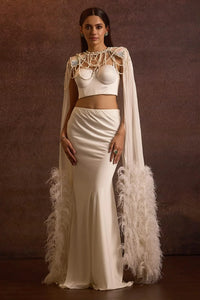 Featuring Seher White Feathered Cape, Bralette, and Bias Fishcut Skirt by The House of Exotique's Nagma Collection. The feather-embellished cape features a beautifully embellished neckline with a center back button elastic fastening. The padded bralette is embellished with a zipper back fastening, and the bias-cut fishcut skirt has a zipper fastening, crafted from crinkle chiffon, Duchess satin, and Lycra satin.
