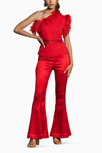 Featuring Selena Co-Ord Set by The House of Exotique. Red Chantilly lace one-shoulder feather top paired with comfortable trousers. Embrace elegance and style in this enchanting ensemble.