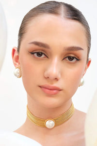 The Senora Chained Choker features elegant white pearls paired with a luxurious 22k gold-plated finish. Crafted from hypoallergenic brass, this stunning choker offers both sophistication and comfort. A timeless piece that effortlessly elevates any look.
