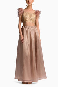 This ethereal set combines the shimmering Senses sequins top, adorned with feathered shoulder details, and the flowing Senses organza skirt. Perfect for graceful occasions, it blends playful elegance with minimalist sophistication.