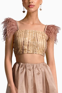 The cropped Senses top features a shimmering sequins fabric, delicately adorned with soft feathered details on the shoulders, adding a touch of playful elegance. Its structured fit enhances the modern, chic appeal of the ensemble.