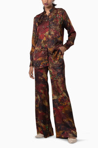 A hand embroidered button up with a mandarin collar paired with a flared trouser of the same print.