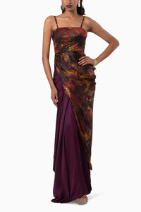 A fitted, ruched kurta with a slide slit paired with a solid floor length draped skirt.