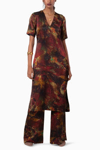 A stylish V neck kurta with half sleeves, paired with a flared trouser of the same print.
