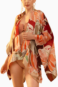 Featuring Sepia Tragano Short Kaftan from Tizzi's Sepia Garden Collection. This short kaftan is designed with thick facing detailing for a flattering fit. It includes clasps that allow you to convert it into a sleeve or drape it like a cape over your shoulder, adding versatility to your beachwear ensemble.