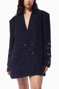 This oversized black blazer redefines modern tailoring with its bold, edgy details. The metal septums adorning the sleeves add a striking feature, elevating the classic black design. With a double-breasted closure and a relaxed fit, this blazer combines sophistication with contemporary flair.