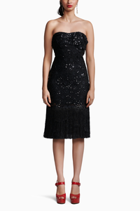 Black off-shoulder midi dress in floral cutout lace with sequin appliqué. Features hand-applied 3D flowers and sequins strategically placed. Fringe detailing at the hem. Side seam zipper. Fully lined.