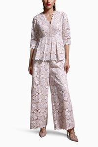 Corset-inspired peplum top in cutout ivory floral lace with clear sequin appliqué. Scalloped neckline, cuffs, and hem. Cropped sleeves. Lined front and back. Hook-and-eye closure. Paired with Wide-leg pants in cutout ivory floral lace with clear sequin appliqué. Scalloped hem detail. Elasticated waistband with side zip closure. Fully lined.