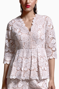 Corset-inspired peplum top in cutout ivory floral lace with clear sequin appliqué. Scalloped neckline, cuffs, and hem. Cropped sleeves. Lined front and back. Hook-and-eye closure.