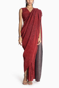 431-88 signature draped sari now upgraded with a sequinned fabric. Lightweight, fuss-free, and easy to wear, it's perfect for the festive season and your destination weddings. Pair it with the matching sequins top for a coordinated look.