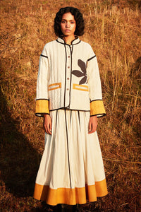 This off-white medium padded jacket features intricate floral patchwork on both the front and back, adding artistic details to its elegant design. A perfect winter choice, it combines warmth with sophistication. The jacket is equipped with two front pockets and a front button closure for both style and practicality, making it a chic addition to your cold-weather wardrobe.