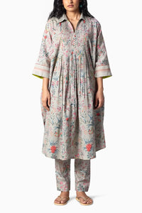 Seren Kaftan in grey, this chintz-inspired floral printed cotton satin kaftan is adorned with fabric-wrapped buttons and features a grey yoke, soft tucks, and intricate multicolour threadwork on the cuffs.