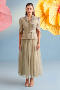 Timeless and elegant, the Serena Set in almond offers a luxurious three-piece ensemble. The intricately embellished lace jacket pairs beautifully with a soft net flared skirt and a structured belt, all adorned with shimmering zircons, pearls, and 3D floral appliqués. It captures the romance of the English era and Parisian elegance — perfect for evening wear and formal occasions.