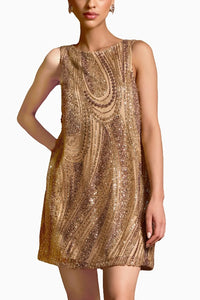 This dazzling gold mini Serenade dress features intricate beading and sequins, creating a radiant and eye-catching look. The sleeveless, A-line silhouette offers a chic and comfortable fit, making it perfect for evening parties or special occasions.