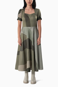 An exquisite interplay of earthy hues and masterful craftsmanship, this patchwork dress embodies effortless sophistication. Crafted from sustainable fabrics, it flows with grace, making it a timeless addition to your wardrobe