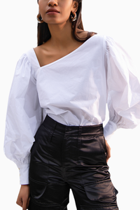 Featuring Serene Snow white Top by Malie. An asymmetrical neckline with balloon sleeves and a wide statement cuff. It fits loosely on the body and is hip length. It's crafted from 100% sustainable cotton.