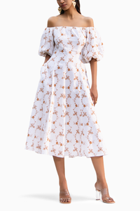 The Serenity dress is an off shoulder dress features schiffli embroidery design all over the body and sleeves with panel detailing on body, enhancing its classic charm. It's crafted from Cotton-Linen blend and slighlty fitted at waist to gives an hour glass shape to the body.