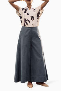 Featuring an off white lino print mul top with front button opening and notched collars, paired with a blue twill flared trouser with front button opening and side seam pockets.