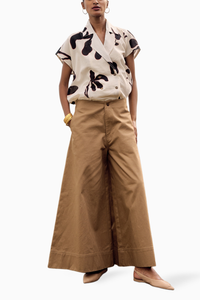 Featuring an off white lino print mul top with front button opening and notched collars., paired with a khaki tan twill flared trouser with front button opening.