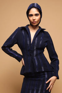 Featuring the Shadowline Shacket, a structured navy blue fitted piece with a sculpted silhouette. It is detailed with tonal hand-embroidered vertical stripes that create an elongating effect and is designed to pair perfectly with the Shadowline Skirt for a bold coordinated look.