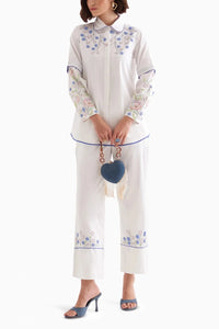 This cotton embroidered button-down shirt set includes a full-sleeve shirt with collars, featuring contrast piping and stitch line detailing. Paired with ankle-length pants, it offers side pockets for added practicality, blending comfort and style seamlessly.