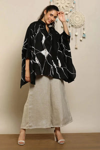 Featuring the Shake The World Square Black Co-ord Set in 100% linen, this comfort-fit ensemble includes a stunning antifit top adorned with abstract prints that evoke shadows and shimmer, paired with matching pants for a chic and relaxed look.