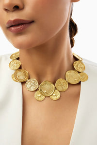 Embody the essence of strength and grace with our Shakti Necklace. This statement piece features a beautiful lotus design on a coin, symbolizing resilience and power in Indian heritage. The intricate peacock design adds an element of elegance. Elevate your style and pay homage to the culture with this exclusive piece.