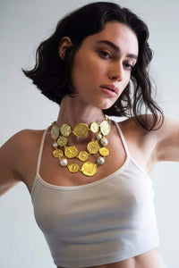 The Shakti Stardust Necklace from the Shakti Coin Collection beautifully blends tradition with contemporary design. Featuring symbols like the Lotus, representing purity and growth, and the Peacock, embodying confidence and strength, this piece is accented with timeless pearls. Celebrate your inner power and elegance—Shakti is power, Shakti is you.