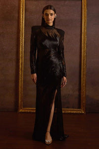 Featuring Shalvi Black Embellished Gown by The House of Exotique's Nagma Collection. This fully embellished gown features full sleeves with shoulder pads and zipper details on the sleeves. The center-back concealed zipper fastening completes this stunning piece, crafted from net and Chantilly lace.