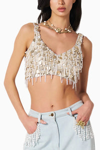 The Shan Blouse is cut with a deep sexy neckline and thin straps. It is hand embroidered with sequins, beads and tassels. It closes on the side with a zip. Pair it with our draped saris or a skirt for a chic look.