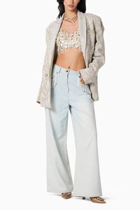 Featuring a deep sexy neckline and thin straps, the Shan Champagne Blouse is hand embroidered with sequins, beads, and tassels, and closes on the side with a zip. Paired with the Aria Blue Jeans, designed with a flattering high waist and structured silhouette, and layered with the Dune Sage Jacket tailored in suiting crepe and embellished with all-over embroidery this co-ord set by 431-88 perfectly merges elevated style with modern sophistication.