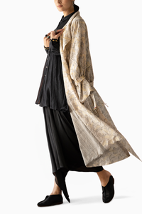Hand Woven Chanderi Trench With A Contrast Printed Lining And Fabric Manipulated Tassel Details.