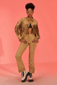 Featuring the Shania Brown Shirt by Chilosophy's Queendom Collection. This Boho-inspired shirt boasts fringes on the upper bodice and intricate floral embroidery on the back yoke. A metallic button closure adds a stylish touch to complete your boho-chic ensemble.